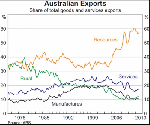 Published figures (see graph below from 2012 – 2013) show the contribution of mineral resources to Australia’s exports – note this includes bulk commodities, with the significant rise from 2005 largely due to increases in volume for iron ore and coal.