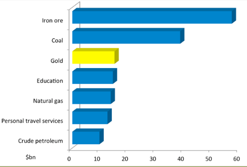 Gold is Australia’s third single largest export after iron ore and coal – the value of Australia’s seven largest exports are shown below – note that out of these five are natural resources and two are services, reinforcing the importance of natural resources to Australia’s wealth.