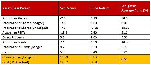 The table also highlights which assets superannuation funds have barely invested in, like commodities, which have been up over 10 per cent, and gold, which was up nearly 20 per cent (in US Dollar terms) between 2006 and 2011. Had superannuation funds devoted a larger portion of their capital into these markets, returns to members would have been significantly enhanced.