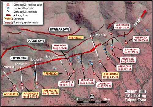 Other results, in particular, from hole AREHRC013 doubled the interpreted depth of antimony-lead mineralisation by approximately 90m on that cross section, while also increasing mineralised thickness.