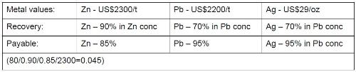 This equates to a zinc equivalent cut-off of approximately 4.5 per cent assuming the following parameters.