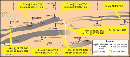 The company completed a program of 15 RC at Yalbra in November 2013, during which drilling within the Main Zone intersected widths of very high-grade graphite mineralisation across multiple parallel zones.