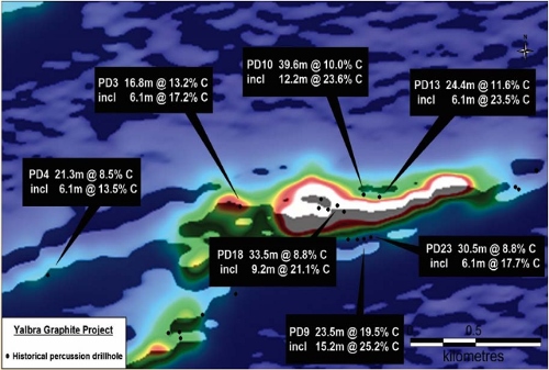 The Yalbra graphite project was subjected to historical drilling that intersected numerous zones of high-grade graphite.