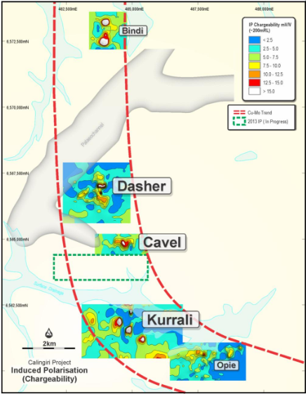 A recently-completed Induced Polarisation (IP) survey at Cavel and Kurrali identified four strong chargeable anomalies the company has interpreted to reflect potential primary bedrock copper mineralisation.