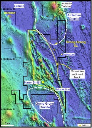 The Grong Grong project also includes the Harry Smith prospect, where historical drilling identified a coherent gold mineralised structure.
