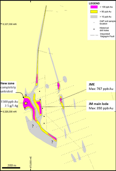 Gold in soil anomalism was also returned over the known JM main lode structure and JM east lode.