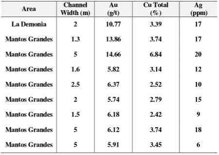 The program has taken a total of forty-three channel samples from the area immediately surrounding the Mantos Grandes mine as well as the La Demonia and Agua del Minero prospects.
