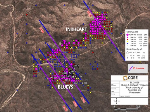 Core said its recent soil results also defined a high core of silver anomalism at both the Blueys and Inkheart prospects.
