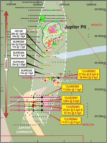 Jupiter plan showing Dacian drill holes, historic intersections and planned holes. Source: Company announcement