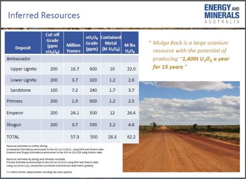 The Mulga Rock project has an Infrerred Resource of 28,300 tonnes uranium (approx. 62.2 million pounds) at 500 parts per million uranium.