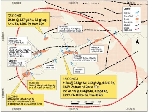 –    115m at 0.58g/t gold, 3.5g/t silver, 0.24 per cent lead and 0.65 per cent zinc from 18m to end of hole, including 47.1m at 0.84g/t gold, 3.5g/t silver, 0.21 per cent lead and 0.63 per cent zinc from 80.4m.