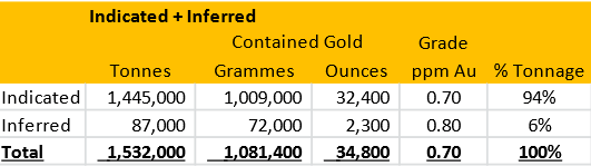 The total resource is 1.5 million tonnes containing 34,800 ounces of gold at an average grade of 0.7 grams per tonne gold.