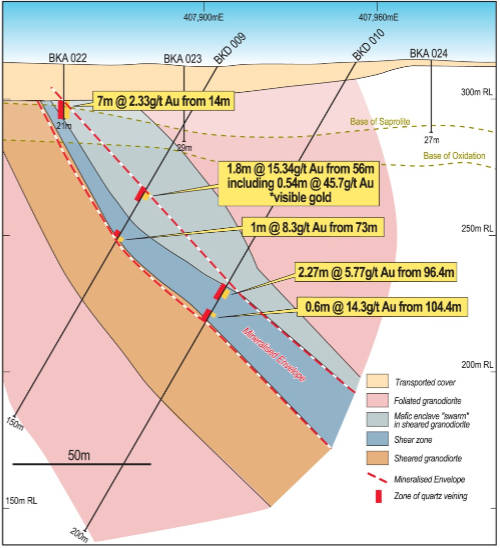 0.6m at 14.3g/t gold from 104.4m in BKD010.