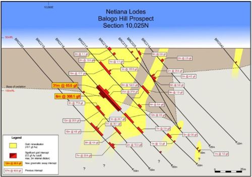 Drill section 10,025N at Netiana showing gold intercepts (new