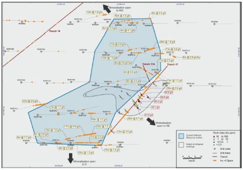 One of these sites is at the Mogoyafara South prospect where Golden Rim has previously defined an Inferred Resource of 3,463,000 tonnes at 1.48g/t gold for a total of 165,000 ounces of gold, which remains open along strike and at depth.