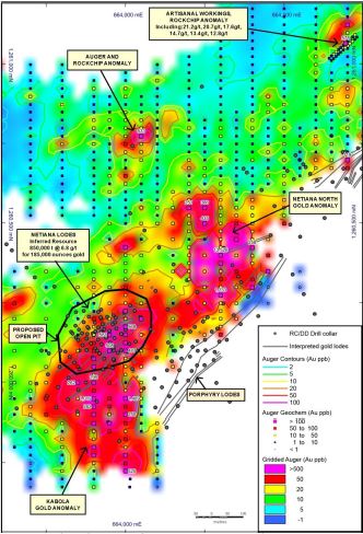 The drilling has also identified another new auger gold anomaly (Kabola), with a peak value of 1,489ppb (1.5g/t) gold, again, in weathered bedrock, 100m south of the Netiana Lodes.