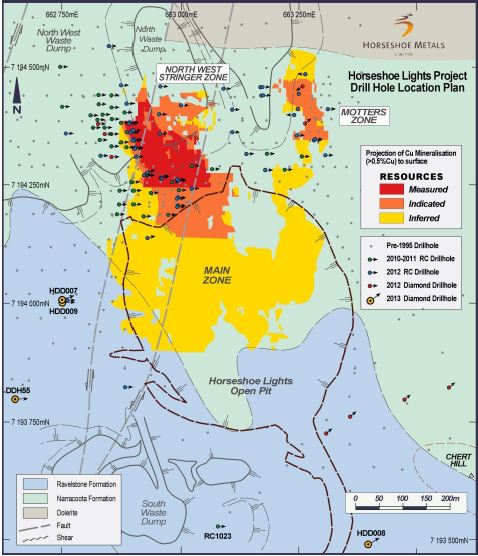 In June this year Horseshoe Metals announced a 40 per cent increase in the in-situ Mineral Resource Estimation for the Horseshoe Lights project to 12.85 million tonnes at 1 per cent copper and 0.1 grams per tonne gold for 128,600 tonnes copper and 36,000 ounces of gold (using a cut-off grade of 0.5 per cent copper).