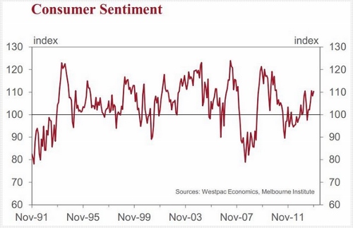Westpac Melbourne Institute Index of Consumer Sentiment lifted to 110.3, suggesting that consumer confidence is on its way back to July-December 2010 highs.