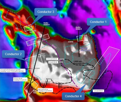 This area is also partly coincident with anomalous nickel-and palladium-in soil responses associated with Conductor 4.