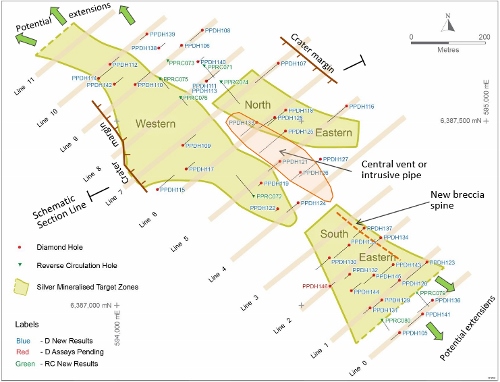 Drilling update plan showing new reported holes only and interpreted targeting elements. Source: Company announcement