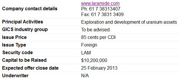 Laramide Resources is listed on the Toronto Stock Exchange (TSX: LAM).