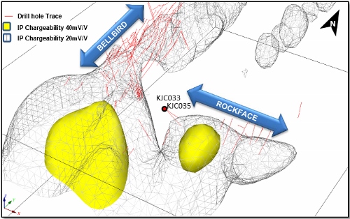 KGL has received approval for a 13 hole drill program on the north (down dip) side of the Rockface prospect with the aim of testing the Rockface IP anomaly and carry out infill drilling along an untested 400m zone that extends between historical Rockface intersections to those recently announced by the company from holes KJC033 and KJC035, including: