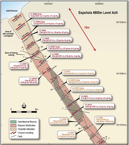 Laconia explained the Española 1 vein system was originally considered as a gold and silver prospect, but was elevated in priority after identification of an historic adit channel sampling intersection.