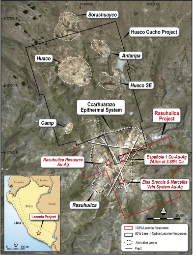 The Huaco Cucho project is located within 10 kilometres to the north of Laconia’s 100 per cent-owned Rasuhuilca project and is within the area of a seven year option held by the company to acquire an indirect 80 per cent interest over 11 additional exploration licences.