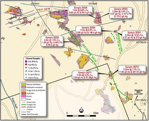 Further compilation of historic results into modern geological software by Laconia includes mapping and surface channel sampling of a series of copper-gold-silver rich veins and breccias extending 400 metres north.