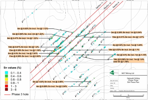 8 metres at 0.47 per cent tin from 39 metres, including 1 metre at 1.33 per cent (DAL119);