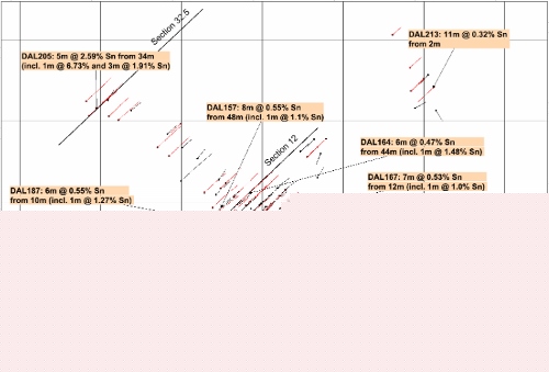 Plan showing drill traces for all holes drilled at Dalcouth and
