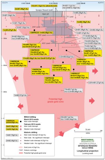 Mithril considers the results to be of some significance as they are equivalent to others it has achieved within 100m of high-grade gold mineralisation at Spargos Reward.
