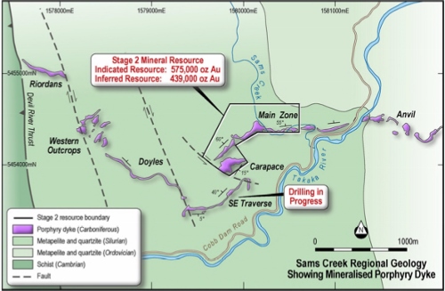 “The porphyry dyke which hosts the gold mineralisation at Sams Creek extends for about seven kilometres over the Sams Creek and adjoining Barrons Flat permits, so we have only tested part of the potential of what could be a large gold system.”