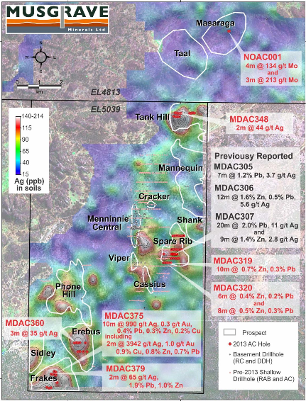 Further drilling has identified additional lead and zinc mineralisation at Spare Rib, located 7km northeast of Frakes and less than 2km east of Musgrave’s Menninnie Central and Viper deposits.