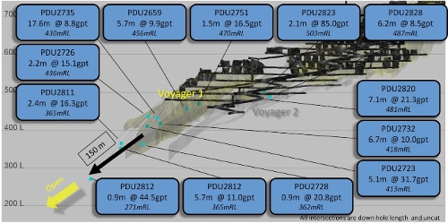 Other drilling at Paulsens has extended the known mineralisation at the Voyager 1 lode by 150m down-plunge from the current resource.