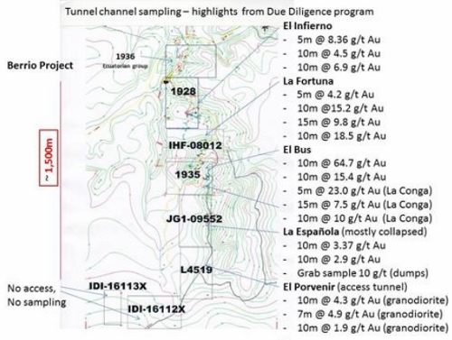 “One channel sample identified a significant high grade of 64 grams per tonne gold over a 10 metre channel sample in the El Bus mine which is centrally located on the tenements.