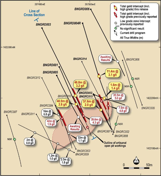 Drill hole locality plan, Bongou prospect. Gold intercepts are
