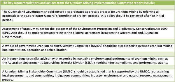 In October the government established the Uranium Mining Implementation Committee and charged it with the responsibility of designing a best practice policy framework for the development and operation of the uranium industry in Queensland.