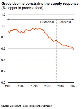 The average head grade at the world’s major mines has fallen by around 20 per cent over the past decade, meaning miners have to dig 20 per cent more earth just to maintain production levels of a decade ago. And the grade decline is set to continue.