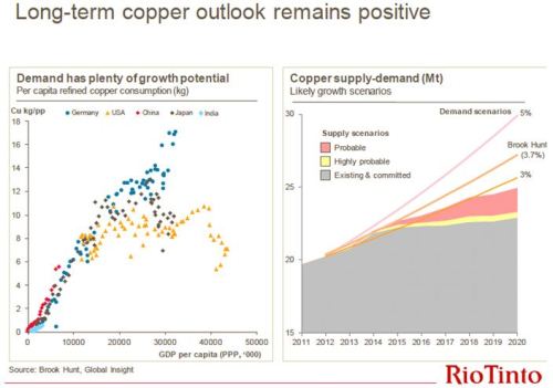 From the charts above, the intensity of copper use increases when economies like China’s begin to evolve from being heavily investment-driven (as they are now) to being more consumption-driven.