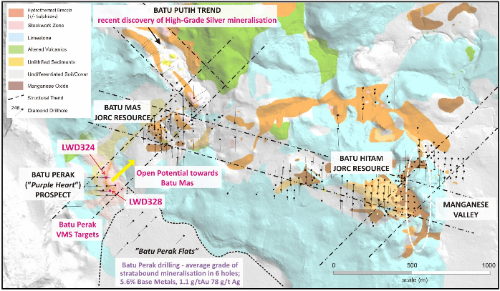 This, the company said, combined with the orientation of the mineralised outcrops and geophysical evidence, suggests there may be a continuous zone of mineralisation beneath thin limestone cover, between Purple Heart and Batu Mas.