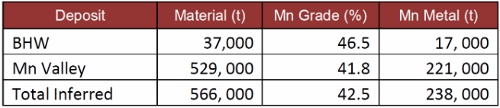 6.2 metres at 45 per cent manganese from 10.8m, including 2.5m at 54 per cent manganese from 13.3m.