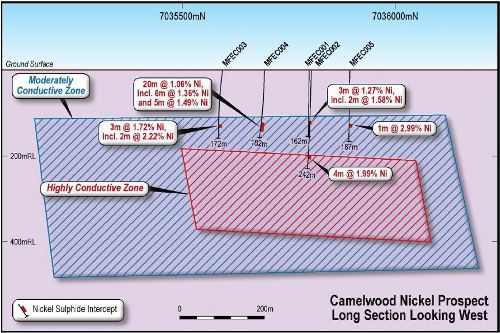 This program included five holes drilled at the Camelwood prospect, all of which the company said intersected semi-massive and disseminated nickel sulphide mineralisation covering a strike length of 300 metres and up to 200 metres vertical depth.