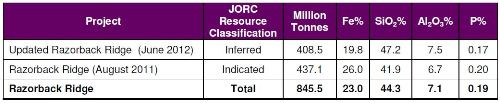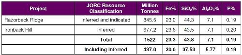 The resource for Razorback Ridge now stands at 845 million tonnes at 23.0 per cent iron.