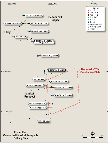 5m at 2.7 per cent nickel from 114m downhole in hole MFEC042, including 2m at 4.7 per cent nickel from 114m;