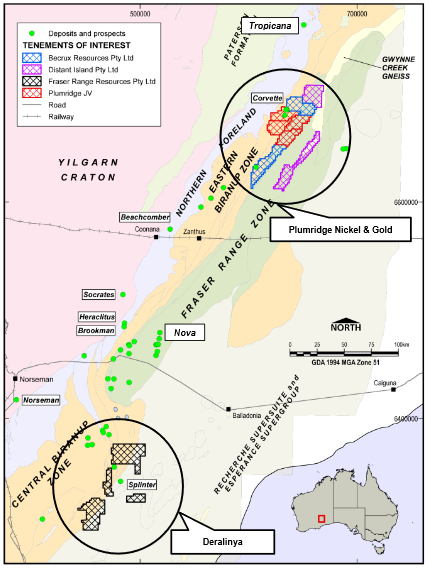 The tenements contain the Plumridge nickel and gold projects in the northern portion of the Fraser Range and the Deralinya project in the southern Fraser Range.