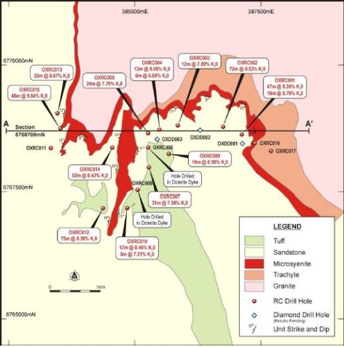 Oxley project drill hole plan with surface geology. Source: Company announcement