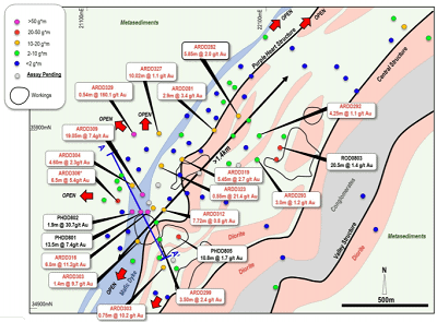 5.9 metres at 39.37 grams per tonne gold from 84.3m, including 3.6m at 63.79g/t gold from 85.4m.