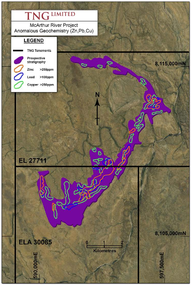 THE DRILL SERGEANT: TNG Limited (ASX: TNG) has identified a large geochemical zone with coincident geophysical targets at the company’s McArthur River project in the Northern Territory located 60 kilometres south of the McArthur River zinc mine.