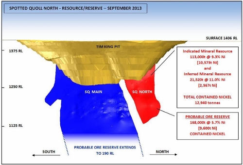 The Mineral Resource for Spotted Quoll north has been doubled to 11,520 nickel tonnes with 80 per cent in the Indicated Category, consisting of an Indicated Resource of 113,500 tonnes at 9.3 per cent nickel for 10,573 nickel tonnes and an Inferred Resource of 21,520 tonnes at 11 per cent nickel for 2,367 nickel tonnes.